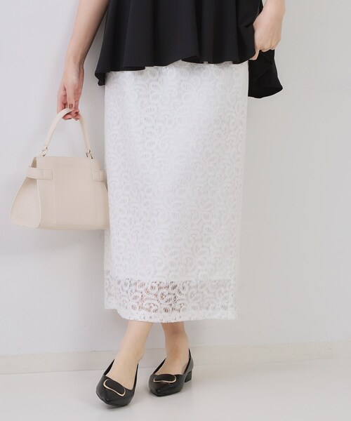 【美人百花9月号掲載】 華やかなレース素材を活かした、シンプルなナロースカート 【デザイン】 ・レース素材を活かし、シンプルな形に仕上げたナロースカート。 ・やや細身のシルエットでありつつも、身体に張り付かず、すっきりとした印象に。 ・ジレやシャツ、短丈トップスなど、トップスをアウトして着こなすコーディネートで今年らしい着こなしが叶います。 ・きれいめに見えるデザインですが、ウエストゴムで楽な穿き心地もポイントです。 ・後ろスリットで足さばきも快適です。 【素材】 ・トレンド感がありつつ、きれいめにも着られるレース素材を使用。 ・コットン混のレースで、カジュアルな着こなしにもオススメ。 ・同色の裏地つき ・マシンウォッシャブルでお手入れも簡単です。 【仕様】 ・ウエスト総ゴム ・裏地つき ・ポケットなし ※こちらの商品はやや透け感があります。 ※照明の関係により、実際よりも色味が違って見える場合があります。また、パソコン・スマートフォンなどの環境により、若干製品と画像のカラーが異なる場合もございます。 モデル情報:身長163cm B82 W62 H91 着用サイズ:38(M) 店舗へのお問い合わせ商品番号:637-73006 ●製品寸法: 38(M):W66~70cm H88cm 総丈83cm 40(L):W70~74cm H92cm 総丈84cm 備考: