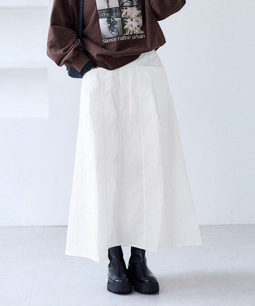 表面の程よいシワ感がカジュアルに着れるウエスト切り替えスカート◆2025秋冬◆<POINT>・ウエストの斜め切替ラインと縦切替ライン。・脇ポケットではなくフロントにポケット。・後ろゴム仕様のため着脱がスムーズでストレスフリーな着心地。【デザイン・シルエット】縦切替とウエストの切替がポイントの軽いポリエステル混素材のフレアスカート。ウエスト周りにポイントもあるので1枚履くだけでデザイン性のあるスカートです。広がりすぎないフレアもポイントです。【素材】少しシワ感があり、少しシャカっとした手触りの生地。軽い素材感ですが、ロングシーズン活躍します。ブラック:綿 69% ナイロン 31%ホワイト:(表地) 綿 69% ナイロン 31% (裏地) ポリエステル 100%【カラー】ホワイトとブラックの2色展開。ホワイトには裏地がついていて透けません。【おすすめのスタイリング】コンパクト目のシンプルなトップスと合わせて着ていただくのと、秋らしいチェック柄のビスチェやシャツと合わせたスタイリングもとてもかわいいです。-----------------------------裏地:オフホワイト(15)のみあり、ブラック(01)はなし光沢感:なし透け感:オフホワイト(15)のみ光に透けるとややあり、伸縮性:なしウエスト:後ろ一部ゴム、ファスナー:フロントありポケット:ありボタン:あり(開閉可、ウエスト部分)生地の厚さ:やや薄手季節:春、夏、秋-----------------------------【モデル着用サイズ】モデル身長:165cm、着用サイズ:F※画像の商品はサンプルです。 実際の商品と仕様、加工、サイズが若干異なる場合がございます。※画像によっては実際の色味と異なる場合があります。正しい色味は生地アップ画像をご確認ください。