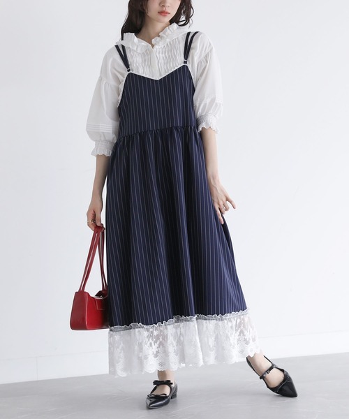 ■デザイン 裾を繊細なレースで切り替えたピンストライプ柄のキャミワンピース。レース部分にはギャザーをたっぷりと寄せたティアードデザインで、動くたびに揺れる贅沢な雰囲気が魅力です。 肩紐は前は二本、後ろはクロスになっており、デザインのアクセントになると同時に、丈感の調整も可能。 身頃の端にはレーステープをあしらい、全体に繊細で女性らしい印象をプラスします。 ■コーディネート フリルやパフスリーブがあしらわれたブラウスを重ねれば、甘さとクラシカルな雰囲気が引き立つ華やかなスタイルに。 一方で、シンプルなカットソーを合わせれば、ワンピースの繊細なディテールが際立ち、 カジュアルながらも品のあるスタイルに仕上がります。 シューズや小物にカラーものをプラスするとアクセントに。 合わせるアイテム次第で雰囲気を自在に変えられるのも魅力です。 ■素材 さらっとしたピンストライプ生地。 一枚でも透けにくく安心してご着用いただけます。 足元には繊細で柔らかなレース生地をあしらい、軽やかさと上品さを演出。