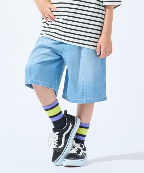 【デザイン】前身頃に色落ち加工を施したカジュアルなデニムハーフパンツです。ゆったりとしたシルエットはリラックス感もあり、動きの多いキッズにもぴったり!フロントの切替デザインや後ろポケットのロゴプリントなど、随所にこだわりの感じる1枚です。【素材】ほどよい肉感の6オンスデニムを使用しています。レーヨン混のひんやりとした特性のあるデニム素材です。【仕様】・ポケット数:横×2 後×1・ウエスト総ゴム・裏地なし※照明の関係により、実際よりも色味が違って見える場合があります。また、パソコン・スマートフォンなどの環境により、若干製品と画像のカラーが異なる場合もございます。店舗へのお問い合わせ商品番号:122-63041●製品寸法:10(100cm):W44~48cm H64cm 股下11cm 前股上25cm 渡り幅21cm 裾幅21cm11(110cm):W46~50cm H67cm 股下14cm 前股上26cm 渡り幅22cm 裾幅22cm12(120cm):W48~52cm H71cm 股下17cm 前股上27cm 渡り幅23cm 裾幅23cm13(130cm):W50~54cm H74cm 股下20cm 前股上29cm 渡り幅24cm 裾幅24cm14(140cm):W51~55cm H77cm 股下22cm 前股上30cm 渡り幅25cm 裾幅25cm15(150cm):W52~56cm H82cm 股下24cm 前股上32cm 渡り幅26cm 裾幅26cm備考:
