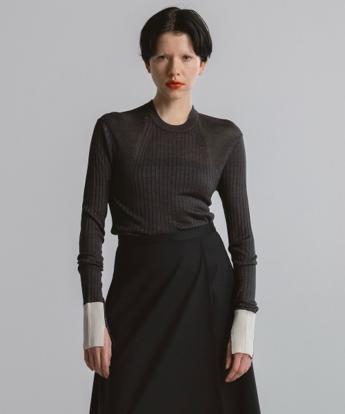 ■説明 繭の上層部「キビソ」のみを使用した高品質なシルク糸で編み上げたタイトニット。自然な光沢としなやかさを兼ね備え、上品な存在感を放つ一枚です。 ■DESIGN ・袖口に配色を施し、一枚でも存在感のある仕上がり ・レイヤードスタイルにも映えるバランスの良いデザイン ■MATERIAL ・繭の上層部「キビソ」のみを使用した高品質なシルクストレート糸 ・シルクならではの自然な光沢としなやかさ ・ウォッシャブル加工により家庭での洗濯も可能 ・繊細な表情と機能性を兼ね備えた希少性の高い素材 ■QUALITY シルク90% ナイロン9% ポリエステル1% ■SPEC 透け感:あり / 厚さ:薄手 / 伸縮性:あり / 裏地:なし / 季節:秋冬 ■生産国 製品生産国:中国 / 糸生産国:日本 ■サイズ 36:着丈59.5cm / 肩幅32cm / 身幅34cm / 袖丈65cm 38:着丈62cm / 肩幅34cm / 身幅36cm / 袖丈67cm ※商品によって若干の誤差が生じる場合がございます。 モデル情報 身長175cm / 着用サイズ:38 ■スタッフ着用感 153cm / 女性 / 普段サイズ:36・38 / 着用サイズ:36 リブの伸縮性があるので36・38どちらでもフィット感はありますが、38だとやや袖が長く感じたため36を選びました。繊細なシルク糸特有の柔らかさと上品な光沢が魅力で、肌あたりもとても滑らかです。編み地がやわらかく肌馴染みも良く、インナーとしても重宝しそうです。 155cm / 女性 / 普段サイズ:36 / 着用サイズ:36 両サイズ着用可能ですが、すっきりとしたシルエットを活かしたくて36を選びました。シルクならではの繊細な艶感が上品で、やや透け感はあるものの気にならない程度。コンパクトなクルーネックはCINOHらしいバランスで、美しいシルエットに仕上がります。 157cm / 女性 / 普段サイズ:36 / 着用サイズ:36 痩せ型体型。38サイズは袖丈がやや長く感じたため、36を選びました。しなやかで柔らかな生地が心地よく、軽やかに着られる一枚です。 158cm / 女性 / 普段サイズ:38 / 着用サイズ:38 襟ぐりは開きすぎず詰まりすぎず、ちょうどよいバランス。着丈はヒップにかかるくらいで安心感があり、すっきり見えするシルエットです。 165cm / 女性 / 普段サイズ:38 / 着用サイズ:38 想像よりも透け感は控えめで、非常に柔らかく着心地の良い素材感。リブ仕様で体型を選ばず、多くの方にフィットするアイテム。袖丈はやや長めで、程よくルーズなバランスで着用できます。重ね着にもおすすめです。 ■BRAND 【CINOH / チノ】 「クリエイティビティ」「エレガンス」「トラッド」をベースに、時代性と本質的な美しさを備えたリアルクローズを提案 上質な素材と高度なパターンメイキングによって、日常に高揚感をもたらすスタイルを追求しています