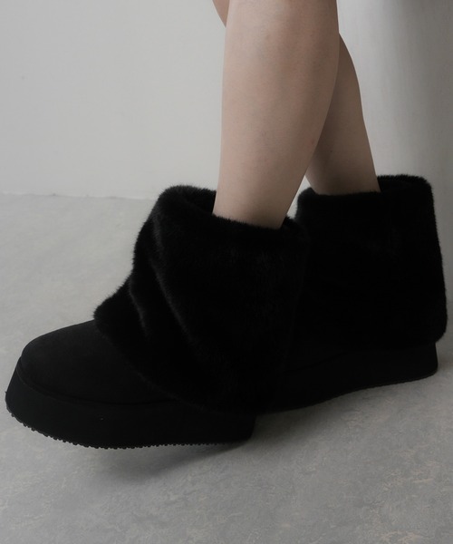 【point/coordinate】・季節感たっぷりのムートンブーツ!・足首まわりにボリュームを出すことで脚をすらっとすっきり見せてくれるシルエット。・ふわふわのボリュームファーカバーを重ねることで目を惹く華やかな雰囲気に。・ファーカバーは取り外し可能でシンプルなムートンブーツとしても合わせることが可能。・ボリュームソールとインヒールで約10cmのスタイルアップが叶う設計!・履き心地は楽なのにこなれ感がある優秀ブーツ。●カラー・合わせやすいアイボリーとブラックの2色展開。●スタイリング・ミニ丈ワンピやスカートと合わせればバランスが絶妙なトレンドスタイルに。・ワントーンコーデでまとめると今季らしいスタイルが完成!【fabric】・本体はスエード素材で見た目にも温もりを感じられる印象。・内側は全面フェイクファー仕様で、真冬でも足を包み込むような暖かさをキープ。・ファーカバーも柔らかく肌ざわりの良いフェイクファーを使用。