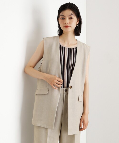 【デザイン】 パナマ素材を使用したジレは、清涼感あふれるデザインが特徴です。 長めの丈感によりヒップ周りをしっかりとカバーし、すっきりとしたシルエットを実現しています。 ノーカラーデザインでシンプルながらも洗練された印象を与え、Tシャツなどとの組み合わせも非常にしやすい仕様です。 同素材040‐63005パナマパンツとセットアップでも楽しんでいただけます。 【素材】 軽やかで通気性のよいパナマ素材は、暑い季節でも涼しさを感じさせ、快適な着用感を提供します。 肌触りが良く、上品な光沢があるため、カジュアルにもフォーマルにも使える素材です。 【着こなしポイント】 このジレは、ノーカラーなのでインナーとしてTシャツやブラウスを合わせたスタイリングがしやすく、オフィスカジュアルやお出かけコーディネートに最適です。 長めの丈感でヒップラインをカバーし、すっきりとしたシルエットを強調できるため、スタイルアップ効果も期待できます。 シンプルなアクセサリーと合わせることで、さらなる洗練された印象に仕上がります。 【仕様】 ・ポケット数:横×2 ※照明の関係により、実際よりも色味が違って見える場合があります。また、パソコン・スマートフォンなどの環境により、若干製品と画像のカラーが異なる場合もございます。 モデル情報:身長166cm B72 W62 H86 着用サイズ:12(M) 店舗へのお問い合わせ商品番号:040-23002 ●製品寸法: 12(M):着丈71cm B105cm 肩幅43cm 13(L):着丈72cm B108cm 肩幅44cm 備考: