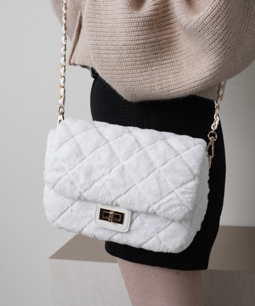 【point/coordinate】・秋冬ムードを高めてくれるふわふわのフェイクファーを使用したファーバッグ。・コンパクトなサイズ感でもマチがしっかりあるので物がたくさん入る仕様。・全体にはキルティングデザインを施し、ほんのりクラシカルで華やかな雰囲気に。・ショルダーチェーンはメタル感があり甘さの中にも大人っぽさを演出。・デイリーにもお出かけにも使いやすいシーズンライクなポイントバッグ!●カラー・ホワイトとブラックのベーシックカラー。●スタイリング・いつものコーデにプラスするだけで華やかさと季節感がアップ!【fabric】・毛足の短い上品なフェイクファーを使用。・起毛感がありつつもボリュームは控えめで上品な印象。