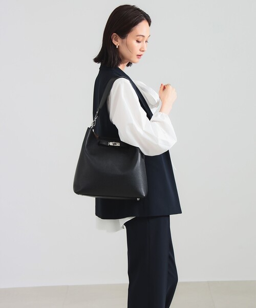 ■デザインフェミニンさとモダンな雰囲気を兼ね備えた、シンプルかつ個性的なデザイン。フロントのストラップと留め具がアクセントになり高級感漂う仕上がりです。インラインはハンドルやフロント装飾がバイカラーですが、全体をワントーンに、ベーシックなシボ革でオーダーした特別なひと品です。■コーディネート仕事用バッグとしてはもちろん、休日のきれいめスタイルにも活躍。シンプルなデザインなので、スーツやセットアップにも好相性です。■ディテール内側にはジップ付きのポーチが付属しており、小物収納も快適。必要なものをスムーズに取り出せる機能的な作りが魅力です。■サイズ長財布やポーチ、手帳など必要なアイテムがしっかり収まる程よいサイズ感。ハンドルは肩掛けもできる長さで、通勤にも便利です。■素材シボ革を使用し、傷が目立ちにくく長く愛用できる素材感。柔らかすぎず適度なハリ感があり、美しいフォルムをキープします。■ケア方法濡れた場合は、軽いた柔らかい布で手早く水気をとり、風道しの良い場所で陰干しして下さい。また、保管の際は温度・湿度が低く光の当たらない通気性の良いところにお願いします。※光の当たり具合やパソコンなどの閲覧環境によって実際の色味と異なって見える場合がございます。予めご了承ください。※商品の色味は商品単体で撮影した画像をご参照ください。GIANNI NOTARO / ジャンニ ノターロイタリアの老舗バッグブランド。トレンドを取り入れたデザインと、革新的な素材にこだわった長く愛用できるコレクション。伝統的な技法と高い品質にこだわり、バッグ製作の全ての工程をイタリアで行っています。
