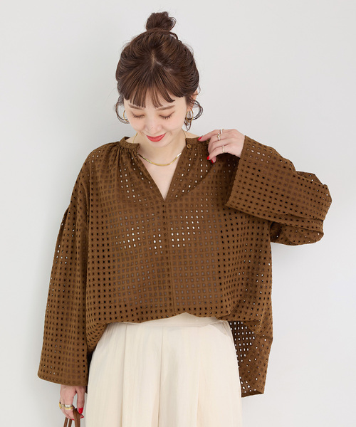 細かなスクエア状のカットワークが特徴的な刺繍ブラウス。柔らかくもハリ感のある素材で仕立てられており、立体感のある表情が魅力的です。ネック周りにはギャザーを寄せ、ふんわりとしたシルエットに仕上げました。前ボタンを開けてスキッパー風に着たり、インナーはベアトップやキャミなどとの合わせが今っぽい抜け感のあるカジュアルスタイルになります。手洗い可能でご自宅でのイージーケアができるのも嬉しいポイントです!**********************透け感:全色やや透け感あり裏地:なし伸縮性:なし光沢感:なし生地の厚さ:普通**********************【スタッフ着用コメント】《スタッフ staff.Y》身長:160cm/普段サイズ:M-L/着用サイズ:フリーサイズ感:全体的にゆったりめです。素材感:柔らかい生地感。着心地:身体から離れるサイズ感で軽い着心地です。※あくまで個人の感想です。**********************※取り扱いについては、商品についている品質表示でご確認ください。・形を整えて干してください。洗濯により収縮やねじれ。型崩れすることがあります。※こちらの商品は、B.C STOCKでの取り扱いになります。 直接店舗へお問い合わせの際はB.C STOCK店舗へお願い致します。※照明の関係により、実際よりも色味が違って見える場合があります。またパソコン・スマートフォンなどの環境により、若干製品と画像のカラーが異なる場合もございます。※商品の色味は、商品アップ画像をご参照ください。 ブラック着用スタッフ:157cm 着用サイズ:フリーブラウン着用スタッフ:163cm 着用サイズ:フリー詳細着用モデル:163cm 着用サイズ:フリー本体:手洗い可能