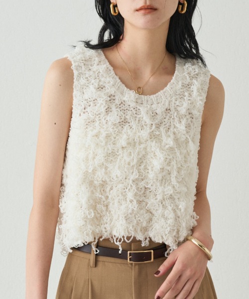 大人の遊び心をくすぐる、主役トップス ■デザイン まるでアート作品のような、表情豊かなテクスチャーが魅力。 シンプルなボトムスに合わせるだけで、洗練されたスタイリングが完成します。 ノースリーブなので、ジャケットやカーディガンを羽織れば、ロングシーズン活躍してくれるのも嬉しいポイント。 ■コーディネート カジュアルなデニムはもちろん、きれいめなワイドパンツやスカートとも相性抜群。 足元はパンプスやサンダルで女性らしくまとめるのはもちろん、あえてスニーカーで外すのもおすすめです。 アクセサリーで個性をプラスすれば、さらにこなれた印象に。 ■素材・洗濯表記 素材:ポリエステル100% 洗濯表記:手洗い可 ●着脱時にベルト・バッグ・アクセサリー・周囲の壁など、表面の粗いものとの摩擦や、 引っ掛かりにご注意ください。 ●クリーニングの際にも、他の物との引っ掛かりにご注意ください。 ●クリーニングの際は、取扱い絵表示をご確認ください。 この製品のフリンジ部分は1本の糸を編み込んだニットです。 ループ状になったフリンジ部分の引っ掛かりにご注意ください。 この製品は素材の特性上、着用時のこすれやもまれによって毛の小さなもつれが発生します。 これは次第に大きくなって毛玉となります。 この現象は避けられないもので次の点にご注意ください。 連日の着用を避け、もし毛玉が発生した場合は引っ張らずに、小さなハサミで一つ一つ取り除いてください。 ウォッシャブルニット製品のお取り扱いについて ●洗濯の際は、30℃以下のぬるま湯にて、市販の中性洗剤を使用してください。 ●製品を裏返しにして折りたたんだ状態にし、片面をそれぞれ20回程度、優しく押し洗いをしてください。 ●濡れた状態での長時間の放置や、漬け込み処理は避けてください。 ●脱水は軽く15~30秒行ってください。 ●洗濯後は、製品を手の平で軽く叩いてシワを伸ばし形を整えて、日陰で平干しをしてください。 ●乾燥機の使用は、収縮・型くずれ等の発生の恐れがありますので絶対に避けてください。 ●洗うと多少縮みます。あらかじめご了承ください。 【♥をクリックでお得な情報をお知らせいたします 】 完売カラーの再入荷やラスト1点の通知、セールの通知を受けとることができます。 【ブランドのお気に入り登録】 新商品や再入荷、いち早くセールやクーポンなどのブランドの情報を受けとることができます。 生産の都合上、お届け時期が前後する場合がございます。 システムの都合上、店舗より入荷が遅れる場合がございます。 実際にお届けする商品と仕様やサイズが異なる場合がございます。 照明や光の当たり具合で色味が違って見える場合があります。