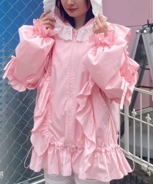 軽やかなスポーティ素材とフリルデザインを組み合わせたフード付きブルゾン。ボリュームたっぷりのシルエットで、両開き仕様のフロントジップが抜け感をプラス。ふんわりと膨らむボリュームスリーブがガーリームードを惹き立てます。裾には幅広のフリルを付けることで気になる腰回りをカバー。裾とフード口にドローコードを通しており用途に合わせシルエットに変化を付けることができます。袖口はホールド感のあるゴム仕様で機能性も◎たくし上げてインナーを見せる着こなしもオススメ。タウンユースや、レジャーシーンの軽めの羽織りとしてシーズンレスでご着用いただけます。・・・・・・・・・・・・・・・・・・・・・・・透け感:なし・伸縮性:なし・生地の厚さ:普通・裏地:あり・・・・・・・・・・・・・・・・・・・・・・・オフホワイト/白×ブラック/黒(ギンガム)、オフホワイト/白、ピンク、ブラック/黒の4色展開【サイズ展開】・FREE(フリーサイズ)#カジュアル#ガーリー#リボン#レース#フリル#キャンスト#キャンスパ#CND●Candy Stripper/キャンディストリッパー●-BRAND CONCEPT-NO RULE, NO GENRE, NO AGE年齢や性別にとらわれず、自由に自分を表現出来る服【お買い物をもっとお楽しみ頂くために】▼商品のお気に入り登録▼完売カラーの再入荷通知や、ラスト1点通知、プライスダウンしたセール通知も受け取れる♪▼ブランドのお気に入り登録▼新作や再入荷等、いち早くブランドのお得な情報が受け取れる♪