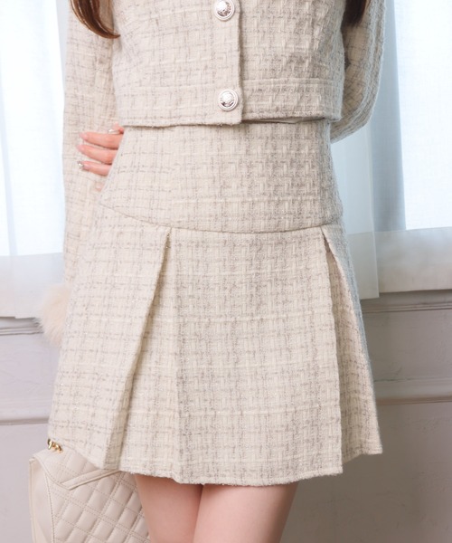 【point/coordinate】 ・プリーツデザインで女性らしい雰囲気を引き立ててくれるミニスカート。 ・ハイウエストで腰位置を高く見せ自然なスタイルアップが叶うシルエット。 ・ウエスト部分はワイド切り替え仕様でしっかりとウエストをマークしてくれるデザイン。 ・後ろはゴム入りで程よいフィット感があり着心地もストレスフリー。 ・バックZIP仕様ですっきりとした後ろ姿に◎。 ・インナーショートパンツ付きで、ミニ丈でも安心感のある穿き心地も魅力! ●カラー ・アイボリーは淡いチェック柄とラメの組み合わせでフェミニンな印象。 ・ミックス1はモノトーン配色の中にゴールドラメが効いた高級感のある雰囲気。 ・ミックス2はグレーベースに立体感のあるドットが映える着映えデザイン。 ●スタイリング ・同素材の《ファースリーブツイードクロップドジャケット》と合わせてセットアップとしてまとまりのあるスタイルに。 ・足元はブーツを合わせるとシルエットにバランスが出て華やかな仕上がりに。 ・ショート丈トップスやコンパクトなニットとの相性も良くレンドライクな着こなしが完成! ▼おすすめコーデアイテム 000455200080 / ファースリーブツイードクロップドジャケット 000455850340 / ボリュームソールミドルブーツ 000455850350 / ボリュームソールショートブーツ 【fabric】 ・アイボリーとミックス1は起毛感のあるツイードでほんのりラメを織り交ぜた高見え素材。 ・ミックス2はLIP SERVICEオリジナルで仕上げた立体ドットツイード。 細かく織り込んだベースに浮き出るようなドットをあしらい表情豊かな素材感に。