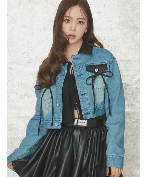 クロップド丈のデニムジャケットは、襟、ポケット、リボンにフェイクレザーを使用しヴィンテージライクに仕上げました。異素材切り替えにすることでカジュアルなデニムジャケットもクラスアップ致します。リボンのディテールがガーリーな要素をプラスしCALNAMURらしいSTYLINGが叶うデニムジャケットに仕上がりました。上からうっすらデニム自体にカラーを乗せているのも今年らしいPOINTです。ミニボトムとの相性が抜群なのでミニボトムやワンピースとの合わせがおすすめです。SETアイテムの592540800201のスカートと合わせて着用するのもおすすめです。
