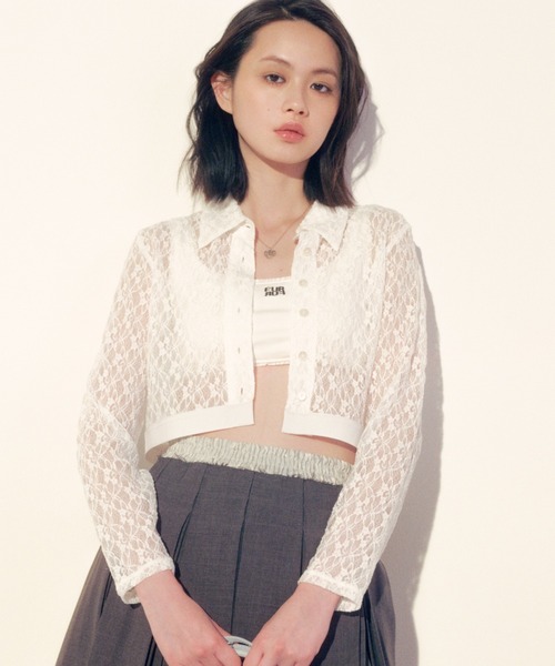 伸縮性のあるレース素材を使用したストレッチシャツです。ボリュームのあるボトムスと合わせやすいコンパクトなサイズ感で、身頃をスッキリと見せてくれて着やせも期待できる一着です。左裾にあるロゴプレートもデザインポイントになります。 透け感;あり 裏地;なし 伸縮性;あり 光沢感;なし 生地の厚さ;やや薄手 ※照明の関係により、実際よりも色味が違って見える場合があります。 またパソコン・スマートフォンなどの環境により、若干製品と画像のカラーが異なる場合もございます。予めご了承ください。 商品の色味は、商品単品画像をご参照下さい。 ※商品画像はサンプルのため、色味やサイズ等の仕様に変更がある場合がございますので、予めご了承ください。