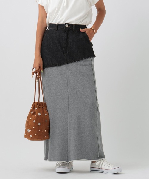 ストレッチ入りで動きやすい異素材ロングスカート ーーー ★おすすめポイント★ [1]デニムとストレッチのきいたスウェット生地をドッキングさせた素材 [2]切替部分の切りっぱなしデザイン [3]後ろスリット入りでより動きやすく ーーー [fabric] ライトオンスのデニムに、ストレッチの効いた柔らかいスウェット生地をドッキングさせた素材を使用。 [design] 今期トレンドの異素材使いのスカート。 デニム生地とスウェット生地の切替部分の切りっぱなしデザインがポイント。 ステッチは金茶にし、カジュアルな雰囲気に仕上げたデザイン。 [styling] INDIAN 2WAY ベストなど、透け感のあるトップスとの合わせがおすすめ。 デザイントップスでもシンプルなTシャツ合わせでも◎ ※屋外での撮影画像は光の加減で実際の商品より明るく見えたり、風合いが異なって見える場合がございます。 商品の色味はスタジオ撮影の画像を参考にして下さい。 ------------------------------------- ≪お買い物をよりお楽しみいただくために≫ ◆商品のお気に入り登録(ハートマークをクリック) 完売カラーの再入荷通知や、完売間近の通知、セールの通知も受けることができます。 ◆ブランドのお気に入り登録 新商品や再入荷など、いち早くブランドのお得な情報を受け取ることができます。 -------------------------------------