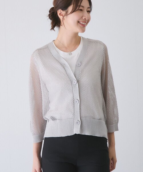 【デザイン・シルエット】 ほどよい透け感のあるメッシュ編みで、重たく見えず軽やかな印象のカーディガン。 ラグラン袖で肩まわりもすっきり見えます。 長めの袖丈が気になる二の腕をやさしくカバーしてくれるのもうれしいポイント。 前開きの釦タイプだから、羽織っても閉じても美しく決まります。 【素材感】 ラメ糸を編み込んだシャリっとした素材は、光の加減でさりげなく輝き、上品な華やかさをプラス。 肌にまとわりつかない清涼感のある着心地で、暑い日でも快適に。 【カラー】 01クロ 08ライトグレー 11シロ 【スタイリングポイント】 カジュアルなボトムスと合わせれば休日のリラックススタイルにぴったりです。 きれいめなワンピースやブラウスに羽織ればオフィスにも対応できる上品な印象に。 オンオフ問わず幅広いシーンで活躍し、夏のコーディネートの幅を広げてくれる、頼れる一枚です。 裏地:なし 光沢感:なし 透け感:あり ポケット:なし 伸縮性:あり 生地の厚さ:普通 ボタン:あり その他仕様:なし 季節:春夏秋 ※撮影時の光、お使いのモニター環境によって色の見え方が違う場合がございます。予めご了承ください。 モデル身長:172cm 着用サイズ:F