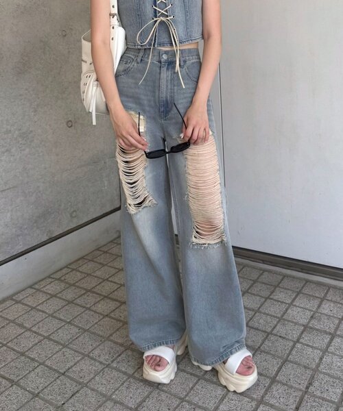 大胆なダメージ加工が特徴的◎ダメージオーバーデニムが登場! 〇商品コメント ・ダメージ具合が、こなれ感と遊び心を演出◎ ・ルーズなシルエットが、リラックス感のあるスタイルを叶えます。 ・シンプルなトップスと合わせるだけで、ワンランク上のおしゃれな着こなしが完成します。 〇スタイリングポイント ・Tシャツやブラウスと合わせた定番カジュアルスタイルに♪ ・足元もスニーカーからブーツ、ヒールまで、どんなアイテムとも相性抜群です。 ----------------------------------------------------- 洗濯:30度限度 手洗い アイロン:低温120℃まで タンブル乾燥:不可 ------------------------------------------------------ 裏地:なし 伸縮性:なし 光沢感:なし 生地の厚さ:普通 ------------------------------------------------------ 商品のお気に入り登録➡お気に入りアイテムの値下げ・再入荷・在庫1点などの通知を受け取ることができます。ブランドのお気に入り登録➡ 新商品や再入荷、セール、クーポン配布などお得な情報を受け取ることができます。※サイト上のカラー名と、お届け商品に記載されているカラー名が異なる場合がございます。※商品の色味は、撮影場所や光のあたり具合などにより色味が違って見える場合が御座います。また、お客様のお使いのPCのモニター環境などにより色味が違って見える場合が御座います。予めご了承の上ご注文下さい。※ご注文いただいた予約商品のお届け時期の確認は、注文履歴ページより行えます。