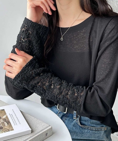 合わせるだけでこなれた抜け感コーデが完成! 袖口のレースが上品な印象をプラスする優秀シアートップス 〇レイヤードが楽しめる袖口レース切替 〇ロングシーズン活躍するスラブシアー素材 〇伸縮性のある素材で着心地楽ちん♪ 〇透け感を楽しめるルーズシルエット ■デザイン スラブ感のあるシアー素材がトレンドライクなカットソー。 レース素材の切り替えデザインを施し、周りと差が付くこなれた雰囲気に! コーデの主役として着用することはもちろん、袖のレースを出したレイヤードコーデも楽しめます。 身体のラインを拾いにくいシルエットなのも嬉しいポイント。 1枚持っておくと着回し力の高い優秀アイテムです。 ■素材 身頃は、スラブ感のあるサラッとしたシアーカットソー。 袖口は、透け感がかわいいレース素材。 程よい伸縮性と厚みでロングシーズン活躍! …………………… 透け感:あり 厚さ:薄め 伸縮性:あり 裏地:なし 洗濯方法:洗濯機 …………………… ■コーディネート キャミソールやブラトップとレイヤードした、透け感を楽しむコーデがおすすめです! ニットやカーディガンから袖口をレイヤードすると、トレンド感◎ ボトムは、ゆるっとしたシルエットなので、定番のデニムやスラックス、タイトスカートと相性抜群! きれいめにもカジュアルにもマッチする、ヘビロテな1枚です。 ※ドロップショルダーデザインです。 ※商品によって柄の出方が異なる場合があります。 ※生地の特性上透けますので、インナーのご着用をお勧めします。 --------------------------------------------------------------------- ※サイズ寸法は実際の寸法と多少の誤差がある場合が ございます。 ※ご覧いただいているPC/WEB環境や撮影環境により、 多少色味が異なって見える場合がございます。 【お買い物をよりお楽しみいただく為に】 ▼商品のお気に入り登録をおすすめします♪ 『♡をクリック!』 完売カラーの再入荷やラスト1点の追加、 セールの際の通知を受ける事ができます。 ブランドのお気に入り登録もご一緒にお願い致します。 ---------------------------------------------------------------------