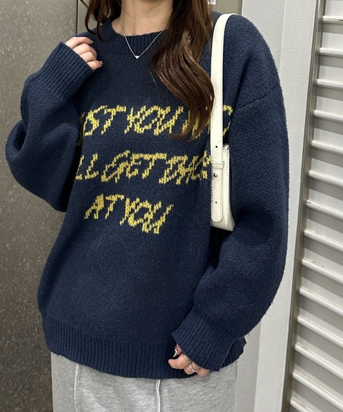 配色カラーロゴが可愛い!こなれ感あふれる主役級ロゴニット〇配色ロゴデザインがアクセント◎〇こなれ感のあるゆるモテシルエット〇ふわっと柔らかい肌触りのモヘアライク素材♪■デザイン手書き風のロゴデザインがおしゃれで可愛いジャガードニットトップス。アクセントになる配色使いが今っぽい1枚。丸みのあるゆるシルエットが抜け感と女性らしさを演出してくれます♪起毛感のあるジャガード素材が高見えに!着るだけでコーデの主役になる優秀アイテムです。■素材程よく起毛感のある肌触りが気持ちいいニット素材。ふわっと柔らかく着心地抜群です。……………………透け感:なし厚さ:普通伸縮性:あり裏地:なし洗濯方法:手洗い……………………■コーディネート配色使いとロゴがしっかりとコーデのアクセントになるので、シンプルなデニムやスラックス合わせでもサマになる1枚です。オーバーサイズのゆるっとした丈感は、ショート丈ボトムとロングブーツ合わせの抜け感漂うトレンドコーデもおすすめ◎ロングスカート合わせの、こなれたスタイリングも女性らしい印象に♪※ドロップショルダーデザインです。※商品・サイズによって柄の出方が異なる場合があります。--------------------------------------------------------------※サイズ寸法は実際の寸法と多少の誤差がある場合が ございます。※ご覧いただいているPC/WEB環境や撮影環境により、 多少色味が異なって見える場合がございます。【お買い物をよりお楽しみいただく為に】▼商品のお気に入り登録をおすすめします♪『♡をクリック!』完売カラーの再入荷やラスト1点の追加、セールの際の通知を受ける事ができます。ブランドのお気に入り登録もご一緒にお願い致します。--------------------------------------------------------------