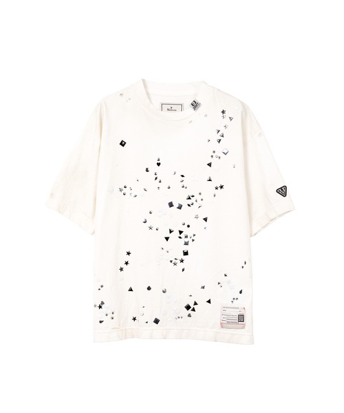 【2025 Autumn/Winter Collection】エンベリッシュドディストレスト Tシャツダメージ加工、ラインストーンの装飾が施されたデザイン。左袖口にオリジナル刺繍ワッペン。クルーネック。着用モデル : 172cm着用サイズ : 38
