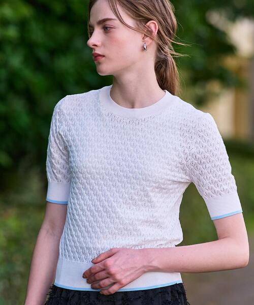 【昨年大人気のニットが新色で再登場!レース編みが可愛いハーフスリーブプルオーバー】●一枚で着用できる、透けにくいレース編みニット●袖口と裾の配色ラインがアクセント●Tシャツ感覚で着られる●こだわりレース編地の凹凸が可愛らしく、見た目にも軽やかなプルオーバー。色目の綺麗さにもこだわりました。薄手でフラットな素材感が多くなる初夏に、レース編みの意匠感をスタイリングに加える事で、着こなしの幅がぐっと広がるトップスです。衿と裾の配色ラインがアクセントになり、シンプルでありながら着映えするポイントに。コンパクトな身頃と着丈バランスで、Tシャツのような感覚でボトムを選ばず着ていただけるようにお作りしました。さらりとしたタッチと伸縮性で着心地が良く、秋の初め頃まで長くお召しいただけます。●素材ヴィスコースとポリエステルを撚糸した糸を使用し、さりげない光沢をもつ、ソフトでさらっとしたタッチが心地よいニット。裏側にストレッチ糸をプレーティングする事で柄の凹凸感とキックバックの良さが加わり、立体感のある目面が生まれます。※照明の関係により、実際よりも色味が違って見える場合があります。また、パソコン・スマートフォンなどの環境により、若干製品と画像のカラーが異なる場合もございます。店舗へのお問い合わせ商品番号:085-13003●製品寸法:34(SS):着丈47cm B78cm 袖丈25cm 肩幅35cm36(S):着丈48cm B82cm 袖丈26cm 肩幅36cm38(M):着丈50cm B86cm 袖丈26cm 肩幅37cm備考: