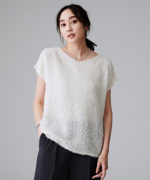 【デザイン】 一枚で着映えするフェザー素材のブラウス。 浅めのVネックでデコルテラインを美しく見せてくれます。 フレンチスリーブのミニマルなシルエットで暑い夏にもおすすめの1枚です。 【素材感】 清涼感、軽量感のあるシアー素材をベースに、ふんわり柔らかなフェザーフリンジを施した素材。 2種類の地柄の組み合わせで、表面感の毛流れに変化をつける事で差別化した素材になります。 女性らしいフェミニンさもありつつ、程よいカジュアルさも兼ね備えたトレンド素材になります。 【着こなしポイント】 同素材の153-73230と合わせてセットアップに着ていただくのも◎。 パンツに合わせるときは前だけタックインするとバランスが取れます。 ※照明の関係により、実際よりも色味が違って見える場合があります。また、パソコン・スマートフォンなどの環境により、若干製品と画像のカラーが異なる場合もございます。 モデル情報:身長161cm B79 W58 H86 着用サイズ:02(M) 店舗へのお問い合わせ商品番号:153-83230 ●製品寸法: 00(XS):着丈52cm B108cm 裄丈31cm 02(M):着丈56cm B118cm 裄丈33cm 04(2LT):着丈58cm B124cm 裄丈34cm 44(3L):着丈58cm B132cm 裄丈36cm 48(5L):着丈60cm B140cm 裄丈38cm 50(6L):着丈61cm B144cm 裄丈38cm 備考: