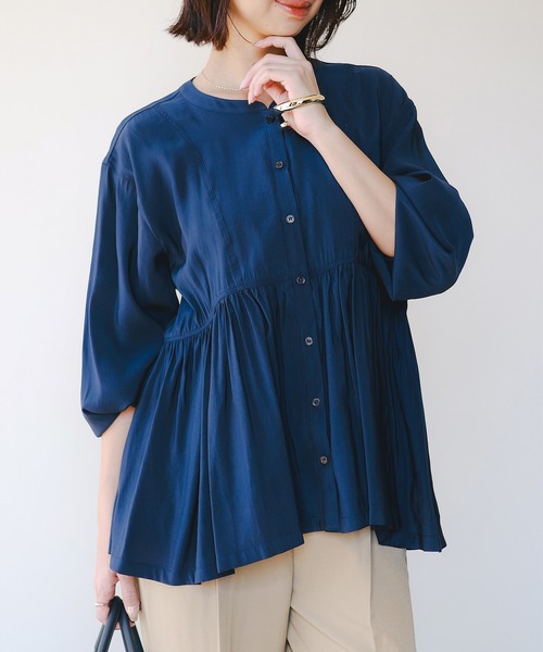 季節の変わり目に活躍 ■デザイン フロントのヨーク切り替えが特徴の前開き仕様のブラウス。ウエストからのペプラムギャザーがレディライクなシルエットを演出し、袖口のゴムギャザーがアクセントになっています。 ■コーディネート 1枚での着用はもちろん、前を開けて軽やかな羽織としても◎。透けすぎない素材感で長いシーズン着こなしを楽しめます。 ■サイズ 全体的にゆったりとしたサイズでリラックスして着用いただけます。ギャザーの程良いボリュームがボディラインをカバーし、女性らしい印象に。 ■素材 パウダー感のある手触りが心地良く、少しハリのあるとろみ素材でカジュアル過ぎない洗練された雰囲気です。 ■ケア方法 洗濯可(詳細は商品についている品質表示ラベルをご覧ください) ※光の当たり具合やパソコンなどの閲覧環境によって、実際の色味と異なって見える場合がございます。予めご了承ください。 ※商品の色味は商品単体で撮影した画像をご参照ください。 ◆お気に入り登録のおすすめ◆ 気になる商品には「お気に入り」登録がおすすめです! 登録していただくと再入荷のお知らせやセール通知など、商品の最新情報が届きます。またマイページでいつでも確認が可能になります。 お得な情報が届くこともありますので、是非ご活用ください。