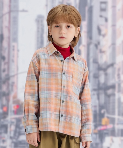 【素材】表面に微起毛加工が施された、ふんわりと柔らかく肌触りの良いオリジナルの綿100%ビエラチェック。薄手で軽く、秋口や春先に適しています。【柄】鮮やかなオレンジベースの濃淡と、ブルーが差し色になったチェック柄は冬の温かみを感じる色目で、スタイリングで映えるアイテムです。 【仕様】オーバーサイズシルエットのゆったりとしたシャツ。1枚で着る事もでき、秋には羽織として使えて、冬にはアウターのインナーに使えるなど汎用性が高く重宝するアイテムです。サイズは110~140サイズ展開です。 【ポケット】あり 【伸縮性】なし 【透け感】透けない 【クリーニング】洗濯機洗い可 【裏地】なし モニター・環境等により実際の商品と色味が多少異なって表示される場合がございます。 また、生産時期により色味が若干異なる場合がございます。予めご了承ください。