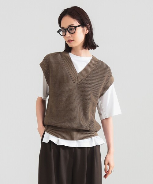 洗練されたベーシックアイテム■デザイン表情のあるざっくりとした畦編みが魅力的な大人のためのニットベスト。シンプルデザインながらも抜群の着回し力で、ワードローブが豊かになるひと品です。■コーディネート1枚でノースリーブベストとしてはもちろん、シャツやカットソーとのレイヤードスタイルもおすすめ。薄手のタートルネックアイテムとも好相性で、長いシーズン着用可能です。■ディテール裾とアームホールはリブ編みで仕上げきちんと感をプラス。オフィスカジュアルとしても活躍します。■サイズ程よくゆとりのあるサイズ。■素材ドライな質感のオーガニックコットン素材を使用。■ケア方法手洗い可(詳細は商品についている品質表示ラベルをご覧ください)【BLACK】BEAMS STAFF:H158 Size:ONE SIZE 【MOCA】Model:H171 B80 W58 H86 Size:ONE SIZE**********************生地の厚さ:やや厚手透け感:ほぼなし伸縮性:あり光沢感:なし裏地:なし**********************※光の当たり具合やパソコンなどの閲覧環境によって実際の色味と異なって見える場合がございます。予めご了承ください。※商品の色味は商品単体で撮影した画像をご参照ください。
