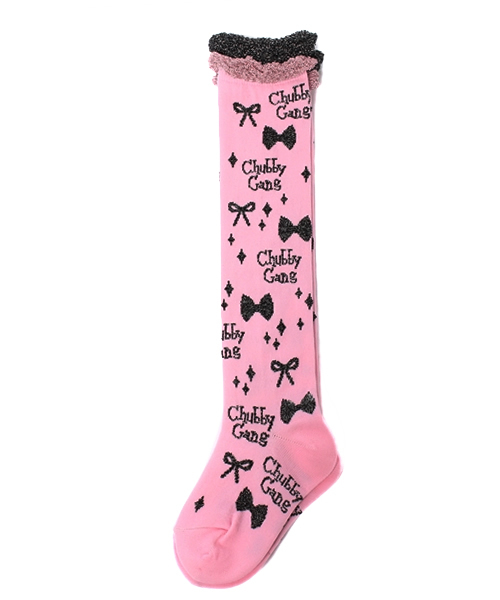 ロゴとリボンのラメ柄が可愛いオーバーニーソックスです。 はきぐちのふわふわしたラメ部分もとってもCUTE。 カジュアルにもプチフォーマルにも◎。