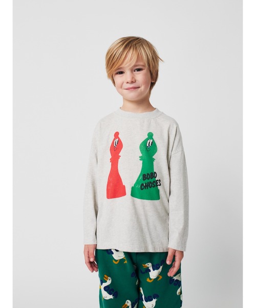 BOBO CHOSESの遊び心あふれる世界観を映し出した一枚。フロントには赤と緑のチェスのビショップがユーモラスな表情で並び、ブランドロゴが大胆にプリントされています。柔らかなコットン素材で仕立てられており、日常使いに快適な着心地を提供。リラックス感のあるシルエットで、カジュアルなパンツやスカートと合わせやすく、デイリーコーデの主役として活躍します。BOBO CHOSESらしいアートな感覚を纏い、遊びと創造性を楽しむキッズにぴったりのアイテムです。