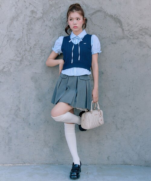 1枚で着映えが叶う!秋のはじまりにぴったりなセット■デザイン・簡単にレイヤードコーデが完成する、ニットベストと半袖シャツのセットアイテム。・ニットベストはケーブル編みで、プレッピーな雰囲気を演出します。・胸元にはロゴプレート付きで、ワンポイントのアクセントに。・シャツは取外し可能な華奢なリボン付きで甘さをプラス!細見えするシルエットにこだわりました。・袖は程よいボリュームのパフスリーブで、二の腕をかわいくカバーしてくれます。・シャツとニットは別々でも着れるので、たくさん着回せます。■カラー・ベージュ/トップグレー/ネイビーの3色展開■スタイリング・ミニスカート合わせでプレッピーなガーリーコーデがおすすめ。・デニムパンツでカジュアルにまとめるのもかわいいです。・シャツの裾は出して着るとトレンド感ある着こなしになります。-----------------------------裏地:なし光沢感:なし透け感:なし伸縮性:シャツなし/ベストあり手洗い:可能タンブラー乾燥:不可アイロン:シャツ110℃まで/ベスト不可-----------------------------model:161cm※着用、お取り扱いの際は、商品についている品質表示とアテンションタグを必ずご確認下さい。※ご覧のモニター環境や撮影環境により実際の商品と多少色味が異なって見える場合がございます。ご理解の程よろしくお願いいたします。※引っかけ注意・粗い組織のものや、表面に凹凸があってルーズな組織のもの表面に糸が浮き出ているものは、ちょっとした不注意から引っかけてしまいがちです。取り扱いの際は取り扱い絵表示確認の上、十分注意してください。・着用時にベルトや、バックや周囲の壁など表面の粗いものとの摩擦や引っかかりに注意してください。・水洗いやクリーニングの際にも他の物ものとの引っかかりに注意して下さい。■お気に入り登録のおすすめ【気になるアイテムを登録】ハートをクリックしてお気に入りに登録すると完売カラーの再入荷やラスト1点の通知、セールの通知を受けとることができます。【ブランドを登録】新商品や再入荷、セール通知など、いち早くブランドの情報を受けとることができます。