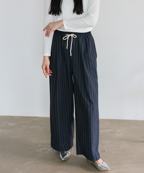 【デザイン】 リネンライクストライプイージーパンツ シャリ感のあるリネンライク素材に、ストライプ柄を織り込んだ大人のイージーパンツ。 通気性に優れた生地で、涼やかさと自然な風合いが魅力。 軽やかな穿き心地で、暑い季節も心地よく過ごせます。 ウエストは総ゴム仕様で、締めつけ感のない快適な着用感。 調整可能なウエスト紐付きで、自分に合ったフィット感に整えられます。 両サイドにはポケットも付いており、実用性も◎。 ホワイトやベージュのシンプルなトップスをタックインすれば、すっきりとした上品な大人スタイルに。 足元にはフラットサンダルやローヒールパンプスを合わせて、抜け感のある洗練された印象に仕上がります。 きちんと見えしながらも、リラックスした穿き心地を叶える一本。 デイリーにはもちろん、ちょっとしたお出かけやリゾートシーンにも活躍します。 【サイズ等】 サイズ:FREE 総丈:101cm 股上:34m 股下:66cm ウエスト(平置き×2):31cm ヒップ(平置き×2):58.5cm わたり幅:34.5cm 裾幅:27.5cm 重量:315g 素材:綿65%ポリエステル35% …………………… 伸縮性:なし 裏地:なし 透け感:なし 生地の厚さ:普通 ポケット:あり …………………… 【お取り扱い上の御注意】 ・繊維および染料の性質上、汗や水で濡れますと色落ちすることがあります。 ・水を含むと縮みやすい為、長時間水の浸漬や浸置はさけ、選択後は直ちに整形し干してください。 ・漂白剤や蛍光剤の入った洗剤は使用しないでください。 ・家庭洗濯時タンブル乾燥はお避け下さい。 [カラー] ベージュ・ブルー・ネイビー ベージュ・ブルー/モデル身長:169cm/着用サイズ:FREE ネイビー/モデル身長:164cm/着用サイズ:FREE ◆商品のお気に入り登録◆ 完売カラーの再入荷通知や、ラスト1点の通知、 セールの通知も受け取ることができますので、是非ご登録ください。 ◆ブランドのお気に入り登録◆ 新商品や再入荷などの情報を受け取ることができますので、是非ご登録ください。