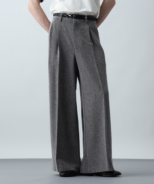 素材で違いを作れる夏仕様のツイードワイドパンツ DESIGN 「凹凸のある表面感で雰囲気抜群のワイドパンツ」 ツイード生地を使用し、表面感に違いが出るデザインに。無地以上、柄未満な見え方で上品な印象に。他のパンツと差別化でき、一枚で存在感抜群。 シルエットは幅のあるワイドシルエットに設定。脚のラインを拾わず、体型カバーをしながらリラックスして履けます。またワイドなことで肌につきにくく、風通しが良いため夏も快適。 幅のあるワイドなシルエットではあるが、センタープレスを入れており、縦長にシャープなシルエットを実現、脚長効果〇 ツイードの上院さと、ワイドシルエットの緩さがモード~クラシックなど、どんなスタイルにも対応可能で幅広く合わせやすい。 ウエストゴムなので楽に履きやすいのもポイント。 MATERIAL 「快適かつ映える、夏でも履けるサマーツイード生地」 夏でも履ける、サマーツイード生地を使用。 夏用に軽く織られたツイードは、凹凸のある織りが肌への接触面を減らし、涼しい着心地を実現します。 糸の凹凸と織りの密度により、リネンやコットンよりもシワが気になりにくいのもポイント。 シンプルなワイドパンツでもツイードの素材感で高級感・洒落感が出せます。柔らかな光沢や霜降り感があり、Tシャツと合わせても品よく見えます。 SET ITEM ブラック系その他 セットアップ対応ジャケットはコチラ→【587999】