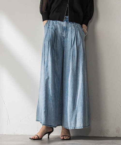 【デザインPOINT】リラックス感がありながら、光沢のあるとろみが女っぽい、バイオシルクデニム・シリーズ。スカート感覚でさらっと涼しく穿けて、大人カジュアルなスタイリングが叶う、キュロットパンツ。タックで波打つシルエットを表現した、フレア・パターン。シルバーのメタル釦、タックをおさえたステッチ、ウエストは楽な履き心地のサイドゴムがポイント。【スタイリング】同様シリーズのシャツとセットアップ対応。ショート丈のトップスはもちろん、ゆるトップスの前裾INもおすすめ。【素材の特徴】【バイオシルクデニム】シルクのような自然な光沢感があり、柔らかくしなやかなリヨセル繊維です。再生繊維ならではの肌への優しさ、吸水速乾による快適な着心地を提供します。----------------------------------------------------------------洗濯方法家庭洗濯:液温は30℃を限度とし、洗濯機で非常に弱い洗濯ができる。自然乾燥:日陰の吊り干しがよい。アイロン:底面温度110℃を限度としてアイロン仕上げができる。ドライクリーニング:石油系溶剤による弱いドライクリーニングができる。----------------------------------------------------------------■モデル身長 166cm 170cm / 着用サイズ M※画像の商品はサンプルとなりますので実際の商品と仕様、加工、サイズが若干異なる場合がございます。※お客様のモニター環境により実際のお色と多少異なる場合がございます。※撮影状況や光の当たり具合により、色合いが異なって見える場合がございます。----------------------------------▼商品のお気に入り登録ハートマークをクリックし、お好きなカラーを選んでお気に入りに登録完売カラーの再入荷通知や、ラスト1点の通知、セールの通知も受け取ることができます。▼ブランドのお気に入り登録新商品や再入荷等、いち早くブランドのお得な情報を受け取ることができます。----------------------------------