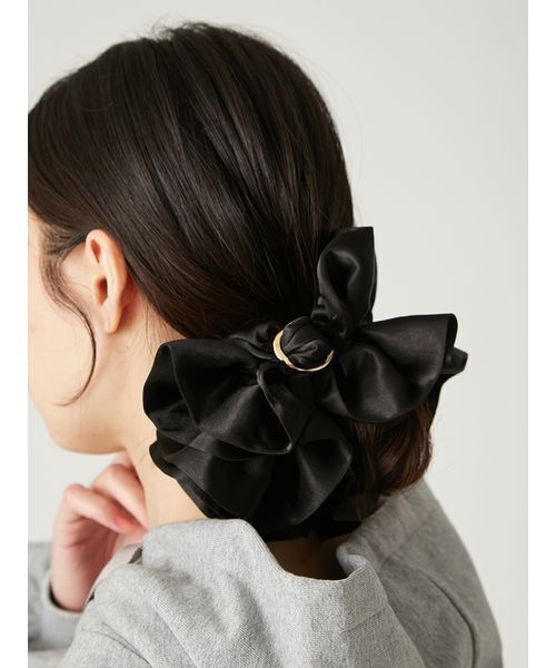 【ダブルフリルを施した、リッチなシュシュ。デイリーからオケージョンシーンまで大活躍】【Design/Styling】上品な光沢感のあるサテン素材やチェックの生地を使った、ボリュームたっぷりなシュシュ。まるでお花のような華やかさです。メタルのバックルがついて、キラリと光るのもリュクスなアクセントに。バックルを中心に、上と下にフリルがダブルでついたデザインで、リッチな印象と高級感が楽しめるヘアアクセです。結んだときにフリルが重なり、まとめ髪に華やかさと女性らしさをプラスしてくれます。デイリーからオケージョンまで、幅広いシーンで活躍してくれる上品なシュシュです。カラーは4色をご用意。サテン地のIVR、BRW、BLKに加えて、秋らしくシックなCHECKで展開しています。※照明の関係により、実際よりも色味が違って見える場合があります。またパソコン・スマートフォンなどの環境により、若干製品と画像のカラーが異なる場合もございます。予めご了承ください。商品の色味は、商品単品画像をご参照下さい。※商品画像はサンプルのため、色味やサイズ等の仕様に変更がある場合がございますので、予めご了承ください。