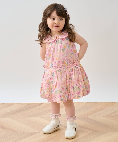 水彩画のようなデザインに心惹かれるワンピースです。 バラを描いた総柄とリボンテープで、上品な印象に仕上げました。 愛らしい表情のバルーンシルエットも魅力。 インナーや羽織を合わせることで、長い期間着用いただけます。 脇部分にゴムが入っており、動きやすいのも魅力です。 内側にお名前を記入できるタグがついています。 【おすすめの着用時期は秋冬シーズン】 【透け感】透けない 【生地の厚さ】普通 【伸縮性】なし 【裏地】あり 【ポケット】なし 【アジャスター】なし