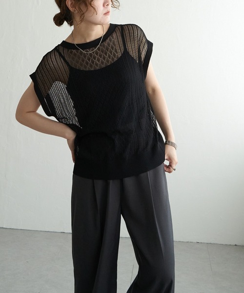 シャリ感のある透かし編みが涼しげな印象を与える2WAYベスト。前あきのボタンデザインで、前後どちらでも着用可能な自由度の高さが魅力です。Tシャツとのレイヤードスタイルがおすすめ!【素材】シャリ感のある、透かし編み。【デザイン】前あきボタン、前後2WAY。【ポイント】今年はさらにシャリ感と軽さにこだわりリニューアル!Tシャツとのレイヤードも軽くできるようにしました。ボタン側はVネック、反対はクルーネックとレイヤードしやすいデザインです。[洗濯方法]洗濯の際はネットを使用してください[クリーニング]手洗い可、ドライクリーニング可(F)、ウェットクリーニング(W)
