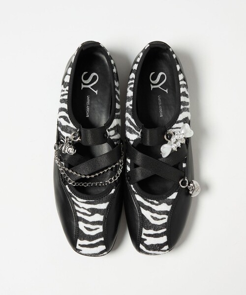 モードとフェミニンのミックスバランスが新鮮なバレエフラット ■デザイン カップインソールや返りの良いソールを使用した快適な履き心地が魅力のフラットシューズ。 バレエシューズのような足当たりのよいフィット感もポイント。 甲のゴムベルトが足をしっかりとホールドしてくれるため歩行時も安心です。 チェーンと異なる3つのチャームは簡単に取り外しが可能。 付属のチャームはもちろん、お手持ちのチャームで部分的にアレンジしてアッパーの変化を楽しむこともできます。 モードなデザインとフェミニンなチャームで甘辛ミックスに仕上げた一足です。 ■素材 合成皮革と生地を使用。 ブラック、シルバー、パープルカラーは光沢のあるメタリック生地。 その他1カラーは、スムース素材とゼブラ柄の起毛素材。 ■コーディネート デニムなどカジュアルなボトムスに、じゃらじゃらとしたチャームでアクセントをつけたコーディネートがおすすめ。 チャームはあえて外し、スラックスに合わせるとモードなスタイリングに仕上がります。 <SY(シー)> 「日常mode〜日常で楽しむモードなスタイル〜」 カジュアルモード・フェミニンモードのテイストのもと、オトナ感、遊び心、シティカジュアル、スタイルコンシャスをキーワードとしたブランド。 未来への憧れもリアルな日常もポジティブに受け入れ、「自分らしくありたい」「恰好良く素敵でありたい」という気持ちを抱く方に、「ありたい自分」を創るきっかけ、理想の「私らしさ」を実現するシューズやファッションを提案します。 【注意事項】 ※生産ロットにより靴箱の色が異なる場合がございます。 ※生産品のハートチャームは<SY>ロゴがブラックです。チャーム単品画像をご確認ください。 ※画像の商品はサンプルです。 ※商品画像は、光の当たり具合やパソコンなどの閲覧環境により、実際の色味と異なって見える場合がございます。あらかじめご了承ください。 ※ソールに保護シートが貼られている場合は剥がしてご使用下さい。 ※かかと部分にある1ミリ程度の小さな穴は、生産工程上発生するものであり、不良品ではございません。 ※シューズの重量は、シューズ本体のみ両足の重量となります。箱や付属品は計測に含まれません。 ※商品に不良が無い場合、包装紙および箱の破損がございましても発送いたします。あらかじめご了承ください。 店舗へお問い合わせの際は、全国のSY UNITED ARROWS各店舗まで下記の品名/品番をお申し付けください。 品名:□S チャームバレエ FLT20↑ 品番:46161000004