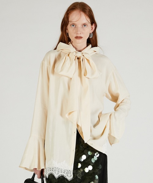 ー Style ー大きいボウタイが特徴的なシャツトップス。ボウタイでありながらフ―ドになっているのでレディ過ぎない抜け感。袖口はベルスリーブになっており、上からニットなどを重ねた際に袖口からのぞかせてアクセントに。裾にもレースをあしらい女性らしく仕上げている。ジャケットを重ねたり、カジュアルに着崩すのがおすすめ。ー Fabric ー【BLK】ほのかにシアー感のあるドットのジャガード素材を使用。【BLU】コットンポリエステルでシワになりにくい先染めのタイプライター素材を使用。【WHT】シルクのような繊細な風合いの再生繊維ビスコースを使用。【PRANK PROJECT/プランクプロジェクト】常識に縛られない洗練された大人の女性に向けて”意外性” と ”品の良さ” をMIXさせた上質なNEW MODE BRAND・商品のお気に入り登録再入荷、残り1点などの通知を受け取ることが出来ます。・ブランドのお気に入り登録新商品や再入荷、ショップのおすすめトピックスなど、いち早くブランドのお得な情報を受け取ることができます。
