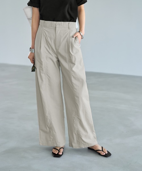 よく見るとものすごくオシャレ! スタッフ達からも密かに狙われている、 絶妙カラーに生地と加工が素敵なパンツ ◆パンツでは少し珍しい生地を使用した、オシャレな質感と縫製加工のパンツです。 ◆生地の質感は当店のアイテムでいえば、【LUXE】ライトタフタ立体タックスカートに近いイメージ。スポーティーなシャカシャカ系ではなくサワサワとした感じで、薄手でマットで品があります。 ◆センターラインの位置で生地をはぎ(=パーツに分けて縫うこと)、縫製箇所をわざと細かくつっぱらせて(=パッカリング)オシャレな雰囲気を付けた、凝ったデザインになっています。 ◆画像では少しわかりにくいですが、ここ数年トレンドの、外側が少しカーブがかった形のワイドフォルムです。目立つほどにカーブしている感じではなく、たまにわかる程度の控えめなカーブ具合です。 ◆ウエスト背面はゴム仕様。脚幅は全体的にかなりゆったりとしており、丈感は長めです。当店のアイテムで言えばシボ生地ギャザーパンツ系と同じくらいの丈感イメージです。 ◆真夏に穿けるサラっとした涼しい着心地ですが、質感的には秋も穿くことができます。冬は寒そうなのでお好みが分かれるかもしれませんが、見た目としては問題ありません。 ◆全体的になんとなくシワっぽいニュアンスもあり、シワを気にせずに使うことができます。アイロンは不要です。 ◆お洋服に馴染みやすい、雰囲気のあるオシャレな2色展開。どちらもグレーをブランドカラーに使用した、クールな印象のニュアンスカラーです。 【お色について】 ◆グレイッシュカーキ:グレーとカーキ色をブレンドしたお色。白や黒などのベーシックカラー全般を筆頭に、赤やオレンジ、青、黄色、ターコイズ、ピンク、グリーンなどのハッキリとした色との共存もカッコ良くこなすお色です。 ◆エアリーグレー:グレーを白っぽくして、ニュアンス程度にミント感も入れたお色。こちらも白や黒などのベーシックカラー全般を筆頭に、ブラウンやネイビー、濃いグレーやエンジなどといった、落ち着きと深みのある色との相性が抜群です。 【お手入れについて】 ※ご自宅で手洗いは可能ですが、質感の美しさや耐久性維持のためにはクリーニングがお薦めです。 ※オシャレ着であることを十分にご考慮の上、お手入れをお願いいたします。デリケート衣類用洗剤および柔軟剤の使用、色移り防止のため単独洗いがお薦めです。 ※最初のうちは水に浸けると染料が多めに浮き出ることがありますので、必ず単独洗いをしてください。 ※洗濯機の普通コース洗い、お湯、脱水機、乾燥機のご使用はお避けください。質感劣化や型崩れや破損、脱色や強いシワ等の原因となります。 ※仕上げやシワのお手入れにはスチーマーがお薦めです。 ※ナノックスなどの洗浄力の強い普通洗剤が直に当たると、その部分が変色することがあります(全てのお洋服で共通)。 ※お洗濯やお手入れは自己責任でお願いいたします。お手入れにまつわるトラブルが生じましても、ご返品・ご交換・ご返金の対象外となりますので予めご了承くださいますようお願いいたします。 仮に『書いてある通りにやった』ということでも、恐れ入りますがその事実確認が困難なことから保障はできかねます為、免責とさせていただきます。