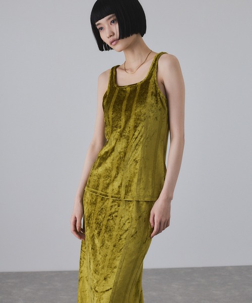 -SELECT ITEM-◆2025-26秋冬◆ADAM ET ROPE' FEMME【Material】ライトウェイト感のあるベロア素材を使用。ほどよくクラッシュ感があるため、ベロア素材の魅力がより際立ちます。 【Buyer’s comment】デコルテを綺麗に見せてくれる、スクエアネックのタンクトップ。 しっかりスクエア感が出るよう、ネックラインにこだわりました。カップ付きなので一枚でヘルシーな肌見せはもちろん、シアー素材のトップスやジャケットのインナーとして合わせても。同素材のスカート(品番:EUC75080)と合わせてセットアップ着用も可能です。【Color】秋らしいネイビーと、華やかなイエローグリーンの2色展開。[Miller/ミラー]1937年に、アメリカのアーカンソー州でRobert P.millerによって作られたアンダーウェアブランド。独自の針抜き仕様「PANEL RIB」は非常に画期的な技術で、1940年代から現在にも続くブランド地位を確立。着込むほどに馴染んでいく着心地の良さから、そのハイクオリティな製品は長きに渡って多くの人々に愛用されている。---------------■メーカーカラー表記(JUN表記)ネイビー(ネイビー)イエローグリーン(グリーン)---------------■メーカーサイズ表記(JUNサイズ表記)F(F)---------------◇モデル情報身長:165cm size:F