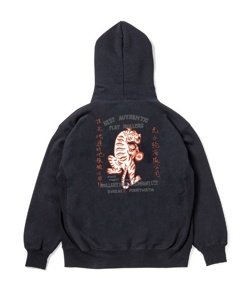 架空のチャイニーズBMX会社rollertiger社のパーカーです。漢字で書いてあるのは左側がbest authentic flat rollers、右側がrollertiger社って書いてあります。
