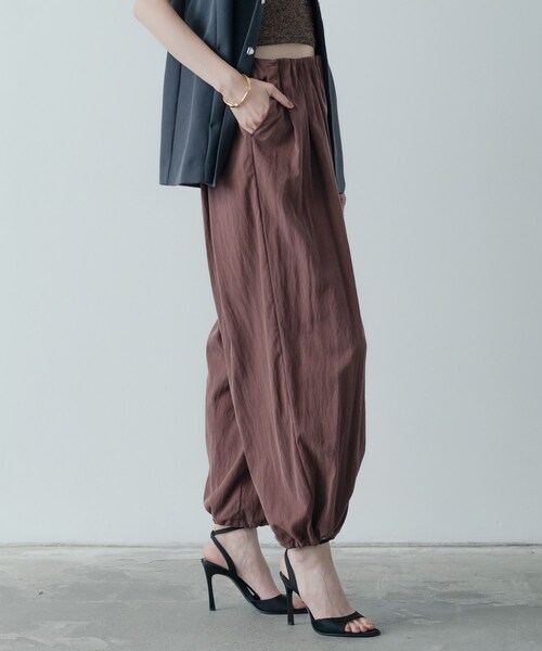 Design Point 軽やかな素材感とボリューム感が魅力的なウエストギャザーパンツ。 ウエスト部分のギャザーがしっかりときいており、ほどよいボリュームと動きをつけています。 裾にかけて一度広がるシルエットは、裾の内側のスピンドルで絞ることができ、キュッと絞れば丸みのあるデザインに。 カジュアルながらも上品さを漂わせ、さまざまなスタイルにマッチします。 Styling Point リラックスした雰囲気を持ちながらも、シンプルなトップスと合わせるだけでも洗練された印象に。 トレンドのレイヤードスタイルにも最適で、ジャケットなどあえてきれいめなアイテムとのコーディネートでほどよい抜け感を出す外しアイテムとして重宝します。 Fabric Point 柔らかく通気性のある素材を使用しており、快適な穿き心地を実現。 軽量感としなやかさを持ち合わせているため、動くたびに美しいドレープが生まれます。 季節を問わず活躍するアイテムです。 モデル身長:174cm 着用サイズ:38(M) ***************************** 気になるアイテムは【お気に入り登録】がおすすめ! 気になるアイテムのページにある「ハートマーク」をクリックして簡単に追加できます。 登録すると、再入荷通知やお値下げ情報をメルマガにてお知らせ。 マイページにてお気に入り一覧もチェックできます。 ***************************** ※照明の関係により、実際よりも色味が違って見える場合があります。また、パソコン・スマートフォンなどの環境により、若干製品と画像のカラーが異なる場合もございます。 店舗へのお問い合わせ商品番号:523-64006 ●製品寸法: 34(XS):W61~97cm H139cm 股下66cm 前股上29cm 渡り幅42cm 裾幅26cm 総丈95cm 38(M):W67~103cm H145cm 股下68cm 前股上29cm 渡り幅44cm 裾幅28cm 総丈97cm 備考: