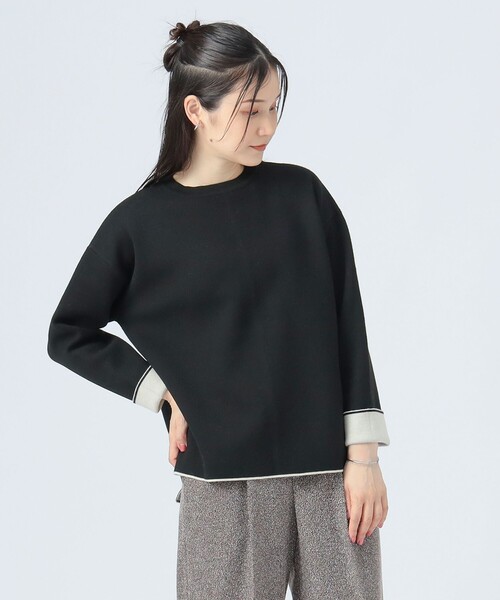 洗練された配色美 ■デザイン サラッとした肌触りが特徴のリバー編みニット。表裏の異なる配色がポイントで、リバーシブル仕様も魅力のひと品です。袖をロールアップすれば、内側の配色カラーが効果的なディテールとして映え、着こなしに奥行きを与えます。体のラインを拾いにくい、程よいゆとりのあるサイズ感も嬉しいポイント◎。 ■コーディネート その日の気分や合わせるボトムスによって、メインカラーを変えるだけで異なる表情に。デニムでカジュアルダウンしたり、きれいめパンツと合わせてオフィススタイルにもマッチします。 ■素材 適度な厚みとハリ感が特徴。リバー編みならではのサラッとしたタッチが心地良く、快適な着心地です。 ■ケア方法 手洗い可(詳細は商品についている洗濯表示タグをご覧ください。) ※光の当たり具合やパソコンなどの閲覧環境によって実際の色味と異なって見える場合がございます。予めご了承ください。 ※商品の色味は商品単体で撮影した画像をご参照ください。