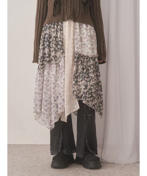 ベルト下フリルは切りっぱなし仕様となっています。ほつれの変化があるデザインです。■デザイン柔らかな小花柄をランダムに配置し、不思議で儚いイメージに。ゆらゆらと動くヘムデザインが夢見心地な可愛らしさをプラスしてくれます。シフォン素材を使用し、優しくふわりとstylingをいろどります。■サイズ感ウエストは総ゴム仕様で、軽やかな着用感。ミディ丈のシルエットで、身長を選ばず着ていただきやすいです。■スタイリングざっくりニット×軽やかで柔らかなミディスカートは不思議な可愛らしさを出せておすすめのstylingです。ランダムな裾丈なので、レースパンツなどのボトムに合わせたり、ロングスカートに重ねてレイヤードstyleを楽しんでも。【商品情報】透け感:表地は透け感あり裏地:あり伸縮性:なし光沢感:なし生地の厚さ:薄手【商品のお気に入り登録】♡をクリック!完売カラーの再入荷や、ラスト1点の通知、セールの際の通知も受け取ることができます。【ブランドのお気に入り登録】新商品や再入荷など、merryの情報をいち早くお知らせします!ぜひご登録ください♡
