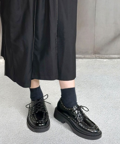 【ASH公式ショップ】 2025 Autumn & Winter Collection スタッズデザインのマニッシュレースアップシューズ。 ステッチの周りに2種類のメタリックスタッズを施したデコラティブなデザインは、モードさとロックな雰囲気をプラスしてくれます。 また、アッパーからソール、シューレースをオールブラックに仕上げたメンズライクな印象はスラックスやジャケット、ドレスなどのドレッシーなスタイルのアクセントにもピッタリです。 さらに、4cmの厚みのあるソールはさりげなくスタイルアップを叶えてくれるだけでなく、ほどよい傾斜で歩きやすい履き心地なのも嬉しいポイント。 シンプルなレースアップシューズでは物足りない方におすすめな一足です。 エッジの効いたモードなドレスシューズを普段のコーデに合わせて、より洗練されたスタイルを楽しんでください。 ■ソール、つま先、かかと部分にはヴィンテージ加工が施されております。 ■天然皮革の為、色むらや軽微な傷が残っていることがあります。これらは全て革製品の特性ですので予めご了承下さい。