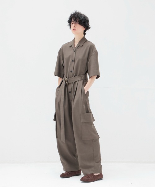 ■DESIGN クリーンでスーツライクな素材にユーティリティディテールを落とし込んで仕上げたジャンプスーツ。 開襟デザインは、通常の衿にひと工夫を加えた葉先のような小ぶりなシルエットで、顔まわりをすっきりと演出。 共布のベルトは、きっちり締めすぎず、軽くウエストマークしてリラックス感のあるスタイリングがおすすめです。 --------------------------- 透け感:なし 裏地:なし 伸縮性:なし ケア方法:手洗い可 ※お洗濯の際は洗濯表示を必ずご確認ください。 ---------------------------