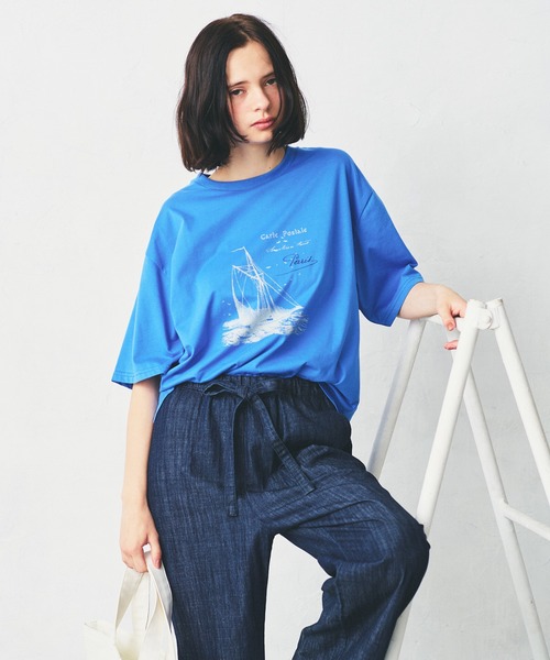 プリントが映えるオリジナルTシャツ夏のマリンスタイルを気軽に楽しめる、キャッチーなプリントTシャツ。フランスのアンティークのポストカードや本から抜き出した、イラストや文字をプリントで表現。クラシックな雰囲気に、遊び心をプラスしたデザインが魅力です。ワイドスリーブと、少し短めの着丈が絶妙なバランスで、トレンド感あるシルエットを演出。1枚で着映えしながら着こなしの幅も広がる、大人の夏にぴったりのアイテムです。コーディネート【カジュアル】ハイウエストのデニムやタックパンツにインして、すっきりとしたマリンカジュアルに。【リゾート】ロングスカートやリネンパンツと合わせれば、リラックス感のあるリゾートスタイルに。※照明の関係により、屋外で撮影した写真の商品は、実際よりも色味が違って見える場合があります。またパソコン・スマートフォンなどの環境により、若干製品と画像のカラーが異なる場合もございます。予めご了承ください。実際の商品の色味は、スタジオ撮影の画像をご参照下さい。※商品画像はサンプルのため、色味やサイズ等の仕様に変更がある場合がございますので、予めご了承ください。アイテム詳細素材:ポリエステル65%,綿35%サイズ: 【F】 着丈:63cm,身巾:56cm,肩巾:50cm,天巾:20cm,衿巾:2cm,袖巾:24cm,袖丈:24cm,袖口巾:19.5,裾巾:56cm====================裏地:なし透け感:ホワイトは少しあり生地の伸び:あり光沢感:なしケア方法:洗濯機可====================生産国:中国品番:12536002※取り扱い・ケア方法については、商品についている品質表示でご確認ください。【LA MARINE FRANCAISE】「海と空と太陽と共に」海と空と太陽の輝く中、風に乗って動き出す。 マリンフランセーズはアンカーを降ろし港で停泊する時を超えて、新たな時代に向かって船出する。風を受け、大きく帆を広げて。南フランスの空や海を愛する女性のイメージから生まれたマリンフランセーズ。普遍的なフレンチのベーシックスタイルを軸に時代の空気感を上手く捉えながら、身につけることで心を満たしてくれる、心にも、暮らしにも寄り添う上質な大人のカジュアルを展開。上質で着心地の良い素材にこだわり、カラーリングやディテールが、ベーシックながらも心をくすぐる、自分らしいライフスタイルを大切にする女性に向けてワードローブを提案します。