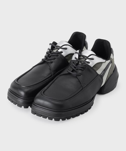 【素材】異なる表面感の合成皮革と合繊生地を使用しています。カラーによって使用している素材が異なります。・アッパー部分(506 シルバーカラー)スムース2種類・ヌバック合皮1種類・ガラス合皮1種類と4種類の合成皮革を採用しています。(519 ブラックカラー)スムース1種類・ヌバック合皮1種類・ガラス合皮1種類と3種類の合成皮革を採用しています。・ライニング部分:ネオプレーン生地・インソール部分:ピッグ調合成皮革・ソール:合成底【デザイン】アッパーがきれいな印象のドレスデザインでありながら、ソールは履きやすいスニーカー仕様に仕上げた「キレイめ」と「カジュアル」のドッキングシューズ。爪先側はトレンドの「ナナメカッティングのスクエアトゥ」でソールはEVAを合皮で包んだ層にタンクソールを掛け合わせ。踵側は「スニーカー」でありつつ「スポーティー」でクッション性の高いヒール合わせ。異なる要素をつなぎ合わせた目新しいデザインに仕上げています。何種類もの素材を複雑に組み合わせることで奥行を出したデザイン。スタイリングの主役になるシューズスニーカー。- BRAND CONCEPT -時代を超えて支持されるトラディショナルなアイテムをベースに、アソビ心とストリートの自由な発想を取り入れ、日本独自のミックススタイルを提案します。【気になる商品はお気に入り登録をおススメ】▼商品のお気に入り登録完売しているカラーの再入荷通知や、ラスト1点、セールの通知をお知らせいたします。▼ブランドのお気に入り登録新商品や再入荷など、いち早くブランドの情報を受け取ることができます。※照明の関係により、実際よりも色味が違って見える場合があります。また、パソコン・スマートフォンなどの環境により、若干製品と画像のカラーが異なる場合もございます。店舗へのお問い合わせ商品番号:979-04606●製品寸法:55(25.5cm):ヒール高5.5cm65(26.5cm):ヒール高5.5cm75(27.5cm):ヒール高5.5cm備考:重量:約495g(サンプルサイズ)