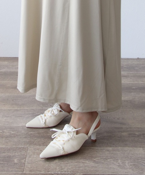 ■【MAISON MAVERICK PRESENTS/メゾン マーベリック プレゼンツ】ニットレースアップミュール【デザイン】"走れるミュール"エレガンスになりがちなヒールを、ストリートとスポーティーに落とし込んだデザイン。カジュアルなのに女性らしい甘さと上品なフォルムがポイント。アッパー部分はポリエステルニット素材で、伸縮性があり足に優しくフィットします。また、フィット感をレースアップで微調節できます。甲深なので足をしっかり覆ってくれ、安定感のある履き心地です。インソールはソフトな合皮で足裏も心地よく、お手入れも簡単です。