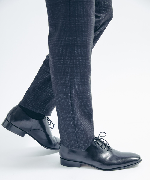 国産オリジナル木型を使ったシャープなシルエットシャープながらもコンサバすぎない木型に、ツヤと適度にムラのある上質なレザーを使用したエレガントな1足。アウトソール、ライニング、インソールなど細かい部分もレザーを使用した、コストパフォーマンスの高いホールカットデザインのシューズです。ホールカットはフォーマルシーンやビジネスシーンにおすすめでき、良くある内羽根や外羽根ではなく、いつもと違って少し変化を付けたいときに履きたいラグジュアリーなシューズ。【素材】高級感のある独特なツヤとムラのあるカウレザーを使用。【デザイン】脚がきれいに見えるよう長めのノーズに設定し、フォーマル感あるセミスクエアのトゥを採用。ホールカットは高級感と洗練された佇まいの見え方になるので、ビジネスシーンだけでなくパーティや結婚式などの華やかな場面に履いて映えるデザインです。『拘りポイント』・極力ステッチを排除したシンプルかつミニマルなデザイン・矢筈コバにすることでエレガントで新鮮な外観を演出※矢筈とは矢の一端の弦にかける部分の事を指す名称ですが、革靴での【矢筈】は、コバの部分を三角形の尖った形に仕上げるスタイルが【矢筈】です。【ディティール】レザーソールにあらかじめラバーの半張りを施しています。インソール、ライニングに牛革を使用しています。インソールはクッション性があるので歩きやすさも◎。【製法】セメント【ソール】レザー+ラバー【ウィズ(足囲)】E相当ホールカットとは・・・アッパーを、ほぼひとつのパーツで構成したスタイル。一枚の革を靴の形になるように木型に釣込んでいくのは、高い製靴技術が求められると共に革の品質が重要視されます。