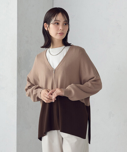 《デザイン》配色がポイントのさっと羽織れるポンチョカーディガン。ポンチョのような大きめのサイズ感でインナーを選ばず上からさっと羽織れます。ヒップをカバーするゆったりしたシルエットです。サイドのスリットのおかげで動きが出て、重たく見えません。フロントはファスナーデザインですっきりと。定番色~トレンドのブラウン系、モードなブラックまで揃った1枚で様になるカーディガンです。コムサモデルズのセミフレアパンツ(38-52PM51-205)と合わせるのがオススメです。1枚でサマになるのでシンプルなボトムに合わせるだけで、おしゃれがワンランクアップするアイテムです。《素材》目面の綺麗なハイゲージで編み立てた高級感ある素材です。なめらかな落ち感があります。チクチクせずしっとりとした肌触りが特長です。薄すぎず厚すぎない厚みでロングシーズン着られます。《同素材シリーズ》同素材でバイカラーポンチョ(12-76KM05-205)バイカラーポンチョベスト(12-76KM06-205)もございます。……………………透け感:なし厚さ:中肉伸縮性:ありポケット:なし洗濯方法:手洗い……………………※画像の商品はサンプルとなりますので実際の商品と仕様、加工、サイズが若干異なる場合がございます。※こちらの商品はFIVE FOXes独自の採寸方法となっています。本サイトのサイズガイドと採寸方法が異なる場合がありますのでご了承ください。
